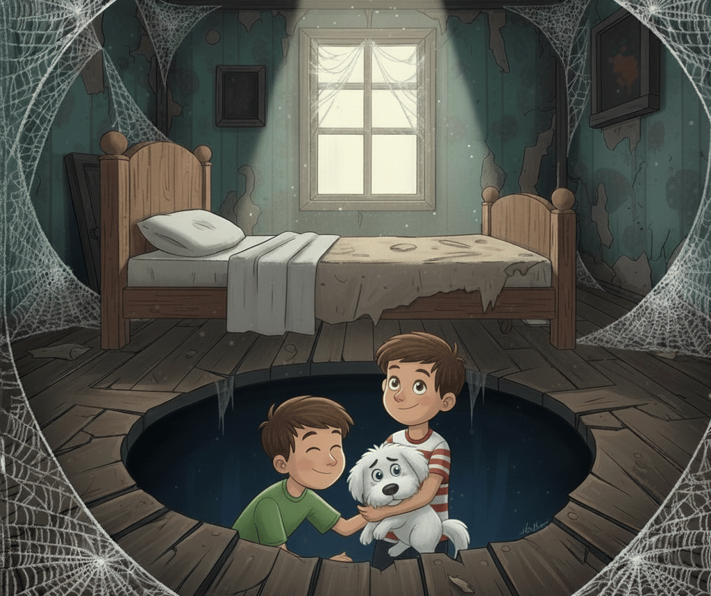 For a moment, we wanted to run, we exchanged nervous glances, unsure if we should risk it. But then we saw through the 7th-room window that Oreo was happily playing with his ball outside. We found the door to the 7th room and crept in carefully. Oreo immediately hid under the bed. Aveer and I crawled closer, but we couldn’t see him. Instead, we noticed a big, dark hole in the floor.