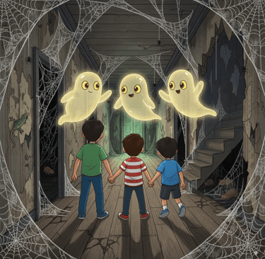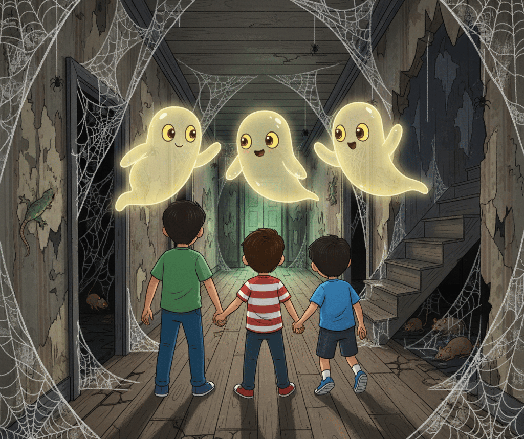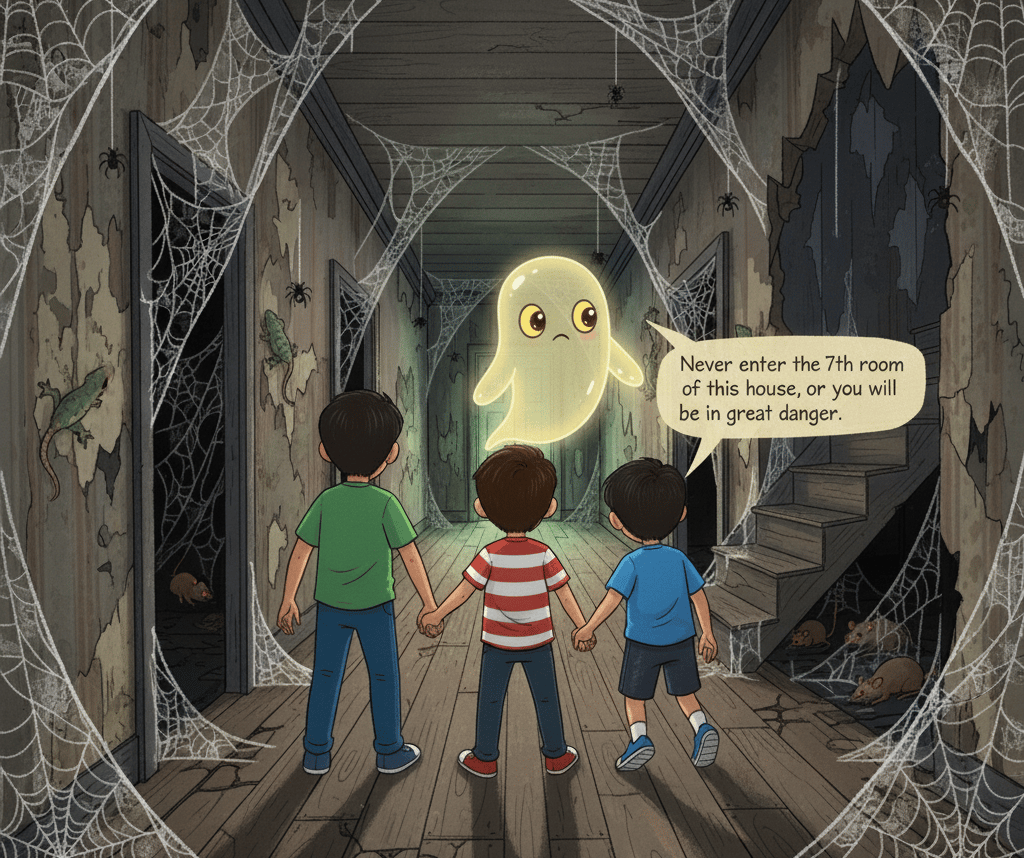 It was a summer morning and the sun was blazing. My brothers Vihan, Aveer and I, Arjun, took our dog Oreo for a walk to the garden near our house. It is usually very peaceful but the scorching sun today made it difficult to enjoy. Right next to the garden stood an old and creepy haunted house. Suddenly Oreo tugged at his leash and ran inside. We gasped in shock as we saw his fluffy tail disappear through the creaky door.