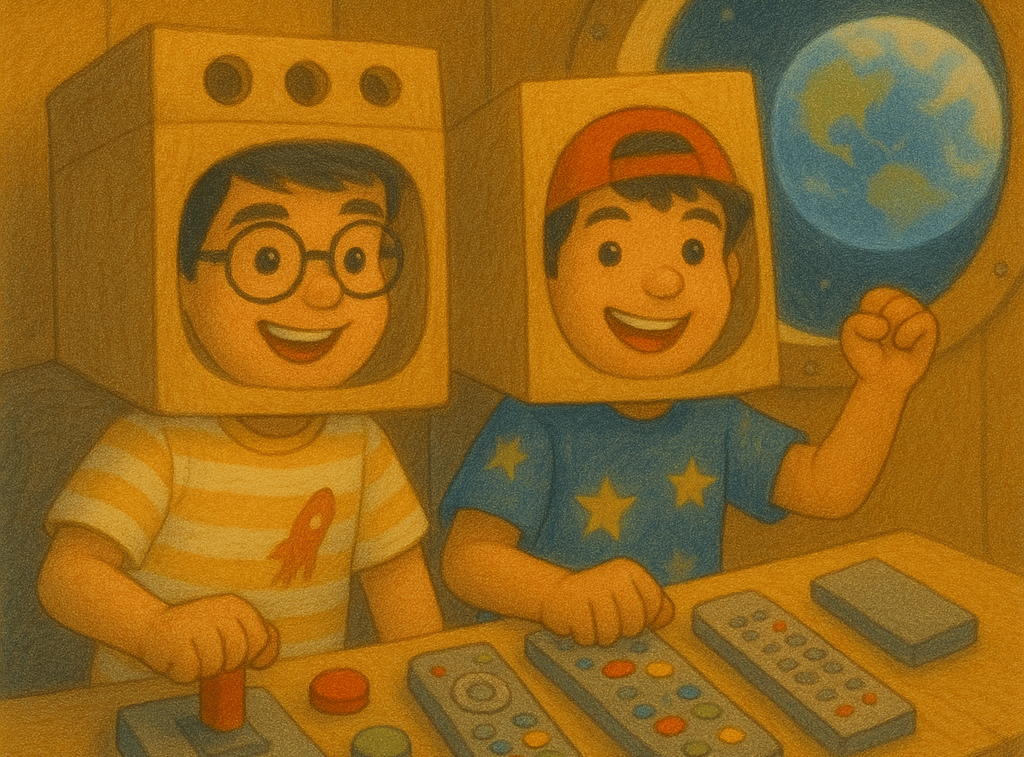 In the store room they found two rockets, their happiness knew no boundaries. They were excited that now they can actually go to space. After days of cutting, soldering, painting and putting together all the different things, their spaceship was ready. They even built a control panel using old TV remotes found in the store room.