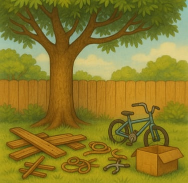 The ground was covered in soft, tickly grass, perfect for lying down and staring at the clouds. Old planks of wood, ropes, broken bicycle parts, and empty boxes were scattered around treasures in disguise.