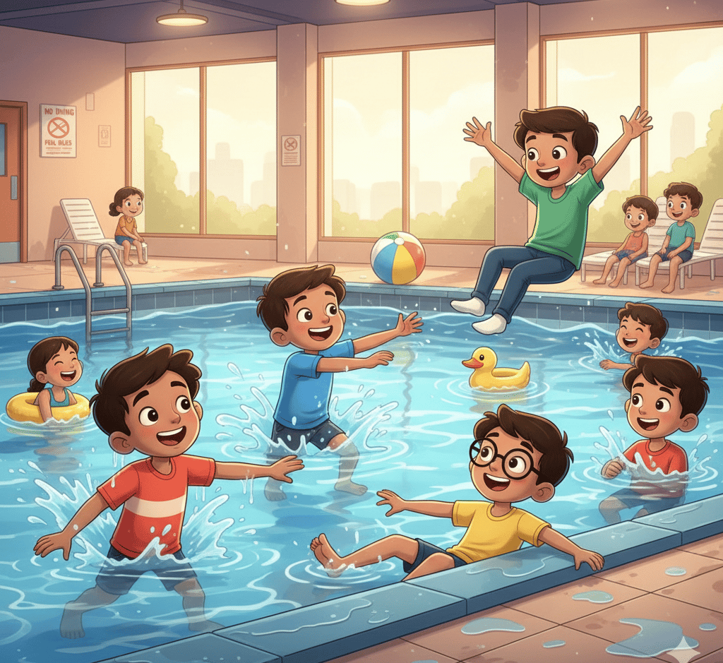 It was a Sunday morning. Me, Ram, Tasaan and Ishan went swimming. Oh! I forgot to introduce myself. I am Kavish. It was Ram’s birthday that day. When we were done swimming, Ram said, “The day is not over. I’ve planned a surprise for all of you!” We got very excited and started splashing water on him. After swimming, we quickly changed our clothes and had breakfast. With our stomachs full, we hopped into the car, and after a short drive, we finally reached the trampoline park.