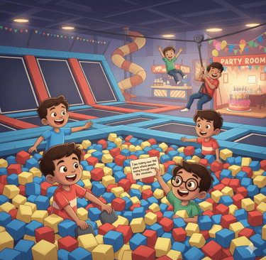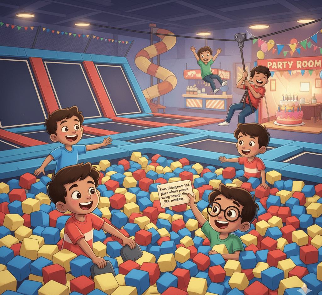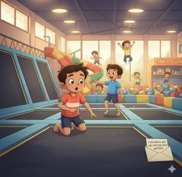 The trampoline park was filled with bright lights, the sound of kids laughing and bouncing high in the air, and the smell of popcorn and fries drifting from the snack counter. We ran off to explore the trampoline park, bouncing from one activity to another- trampolines, ziplines, and slides. Time flew by as we laughed and played, until suddenly we noticed Ram was missing. At first, we thought he was just hiding, but when we called his name, there was no reply.