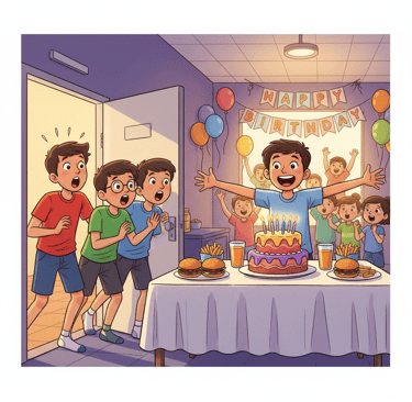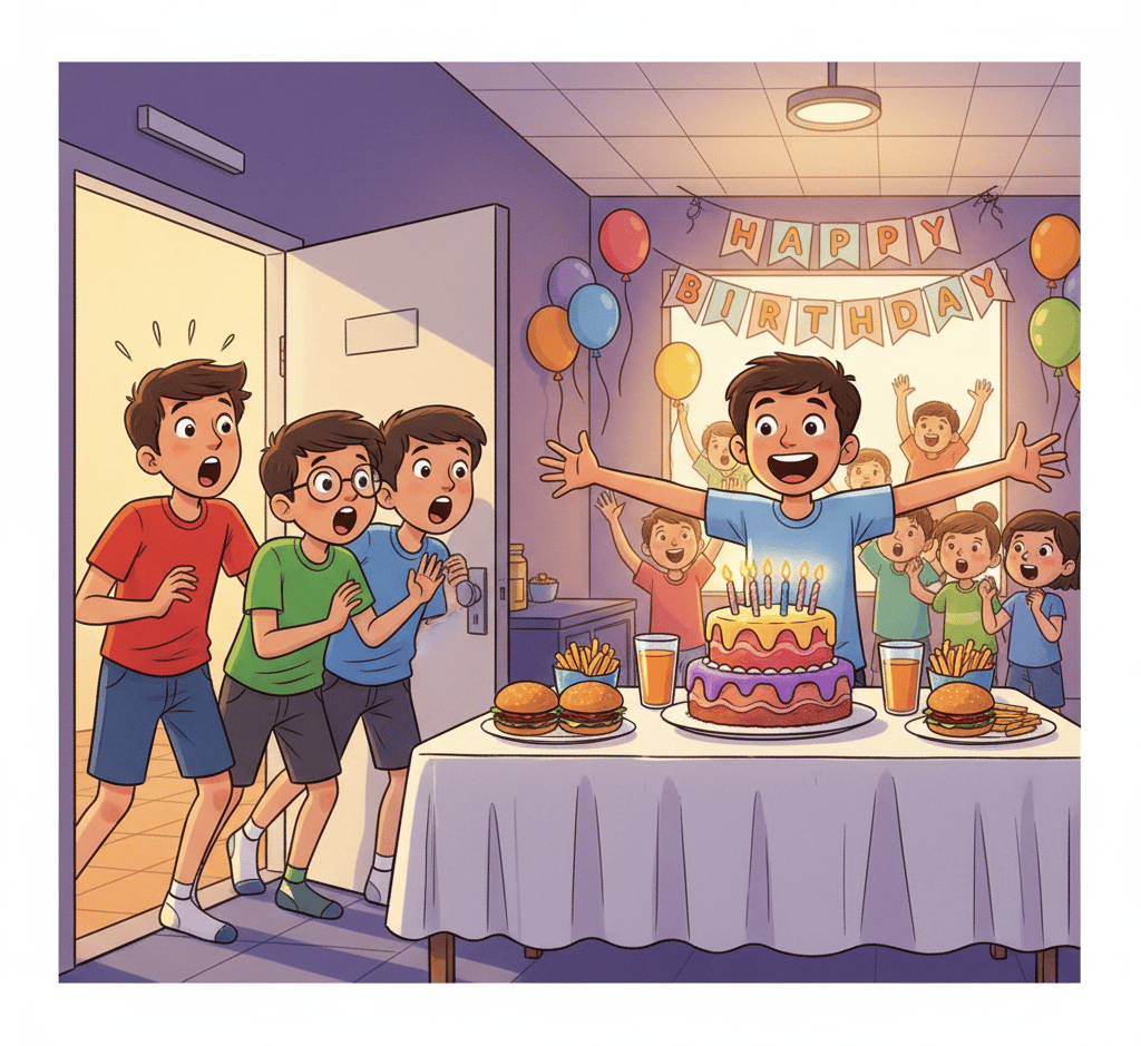 Kavish shouted in excitement, “It is the party room.” We all ran to the party room. There Ram was there with a cake! The moment they opened the door, Ram shouted, “Surprise!” grinning from ear to ear. We got very excited. We sang “Happy Birthday” to him and he cut the cake. Then all of us sat at the table to eat. We had burgers, French fries, and juice for lunch and the last thing we ate was the cake.