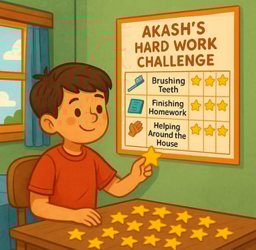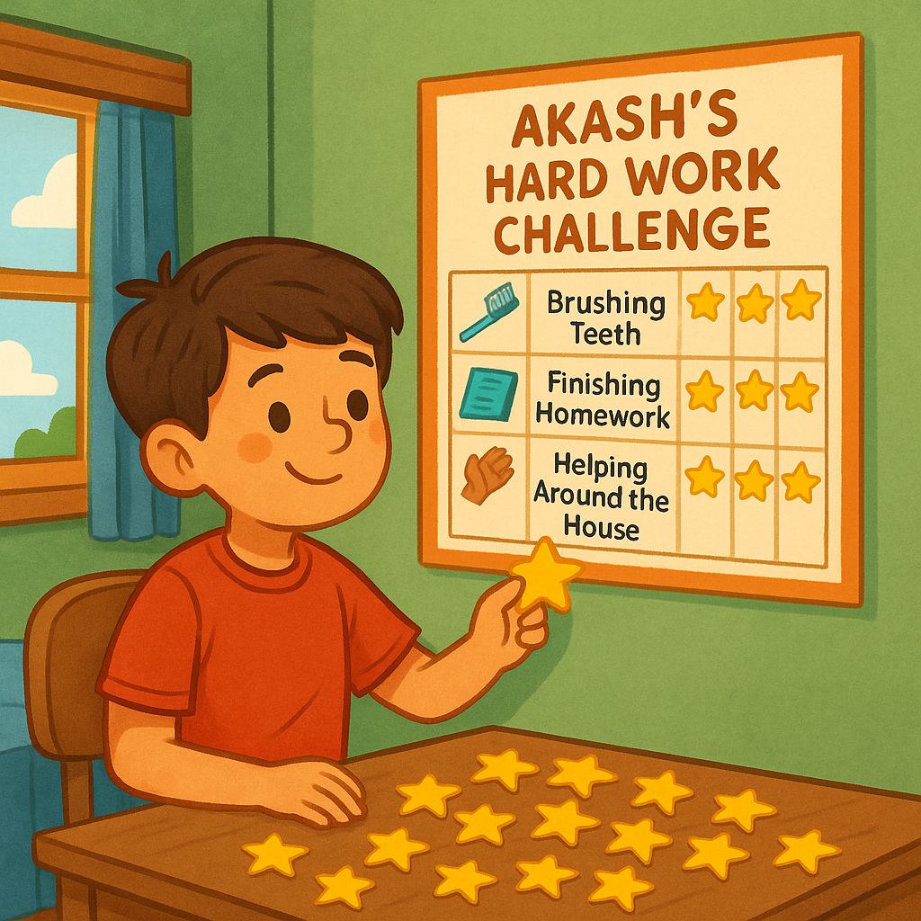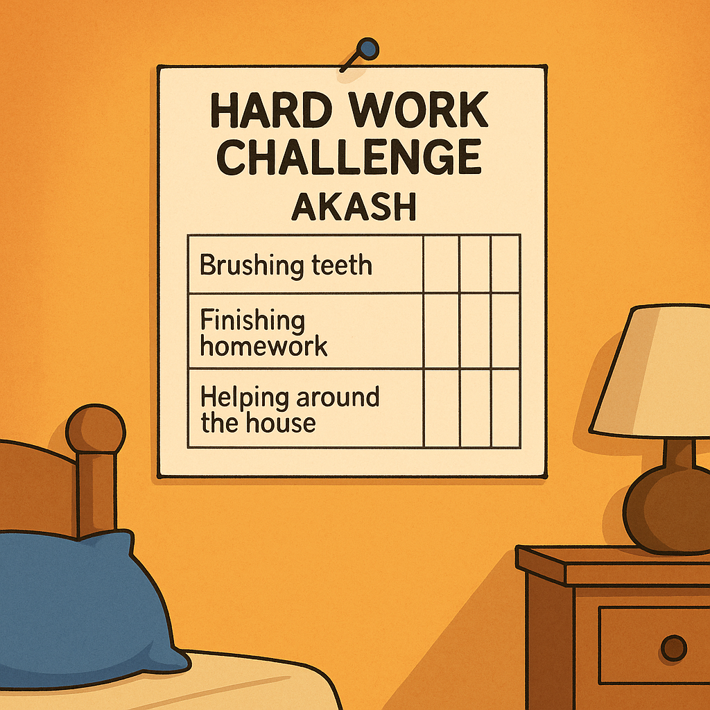 That evening, Miss Sakshi called Akash’s mother. Together, they came up with a plan. The next morning, Akash found a small chart on the wall with his name on top. It was a Hard Work Challenge.