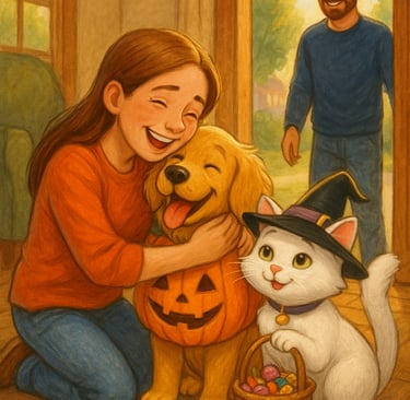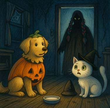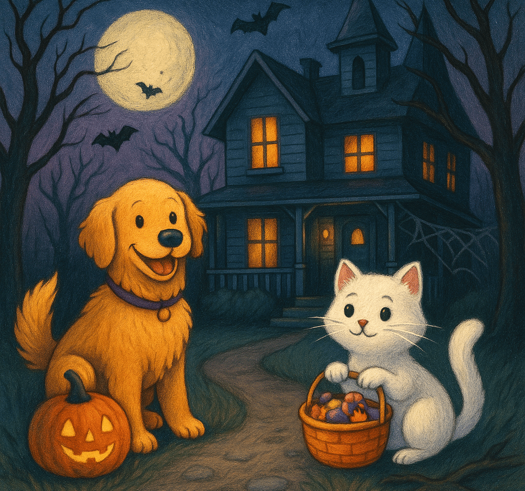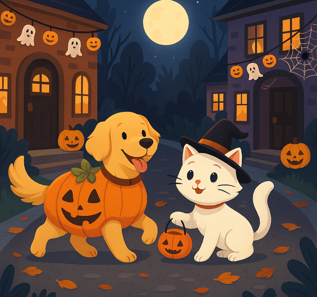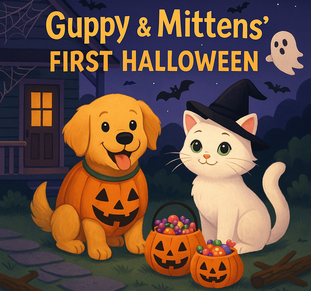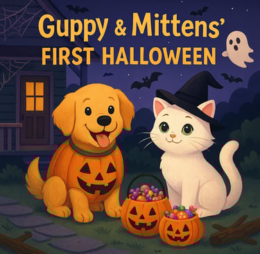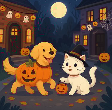 Guppy and Mitten dashed down the stairs, their tails wagging and whiskers twitching with excitement. Halloween night had finally arrived! The streets outside were glowing with spooky decorations, jack-o'-lanterns, and cobweb-covered porches. They couldn’t wait to join the moonlit trick-or-treat fun.