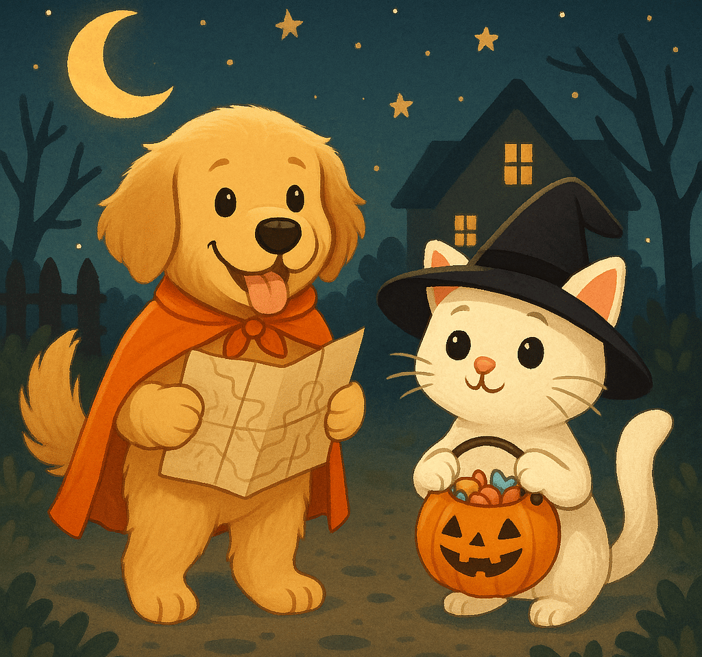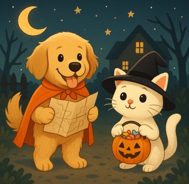 Guppy grabbed the map gently in his mouth, and Mitten took the candy basket in her paws. Off they went, their hearts pounding with excitement as they trotted into the cool October night.