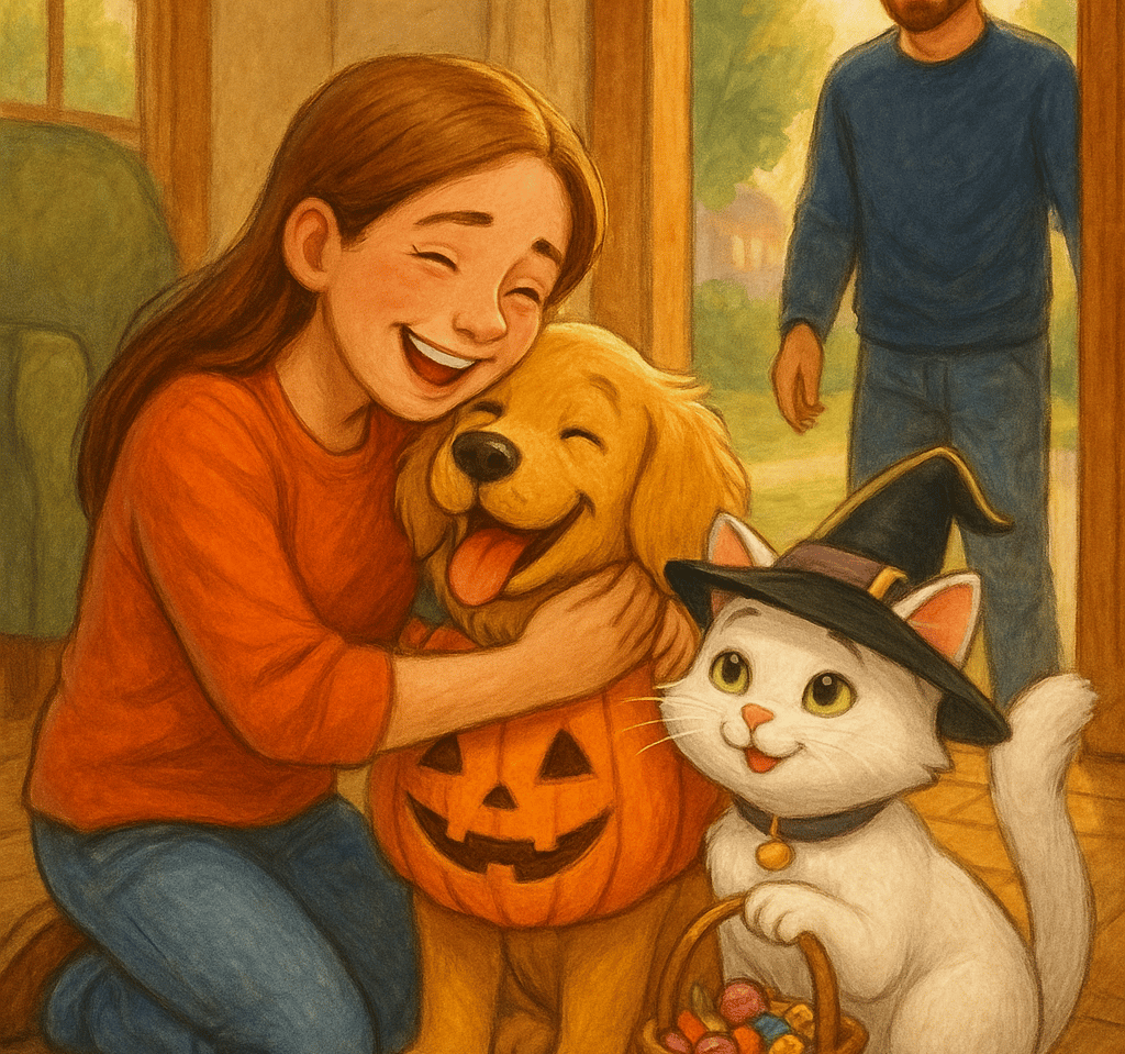 Teddy, a big golden retriever, barked back, “You can have some extra-juicy pumpkin gummies but only if you can scare me!”