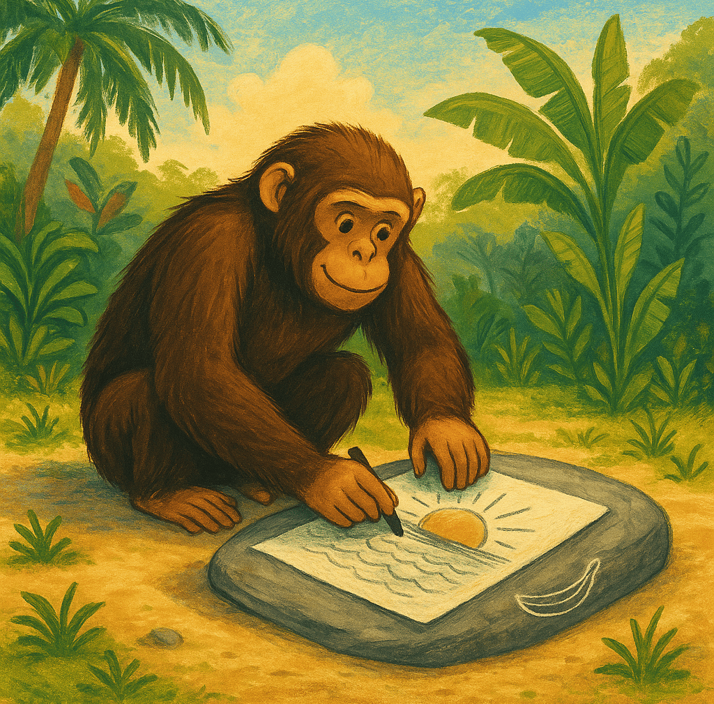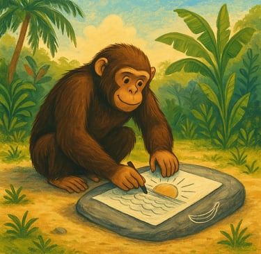One morning, while walking near a grove of banana trees, Ellie spotted something curious. A large ape sat by a flat stone, holding a charcoal stick, drawing in the sand.