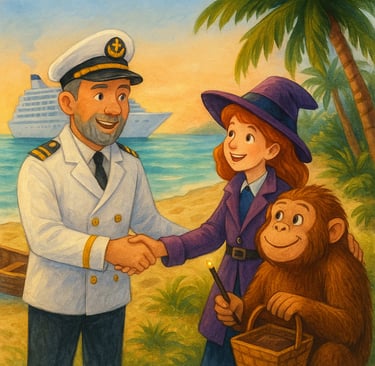 Quickly, Ellie used her magic to send colorful sparks into the sky. The ship slowed down and turned toward the island. A sailor in a blue cap came ashore on a little rowboat.