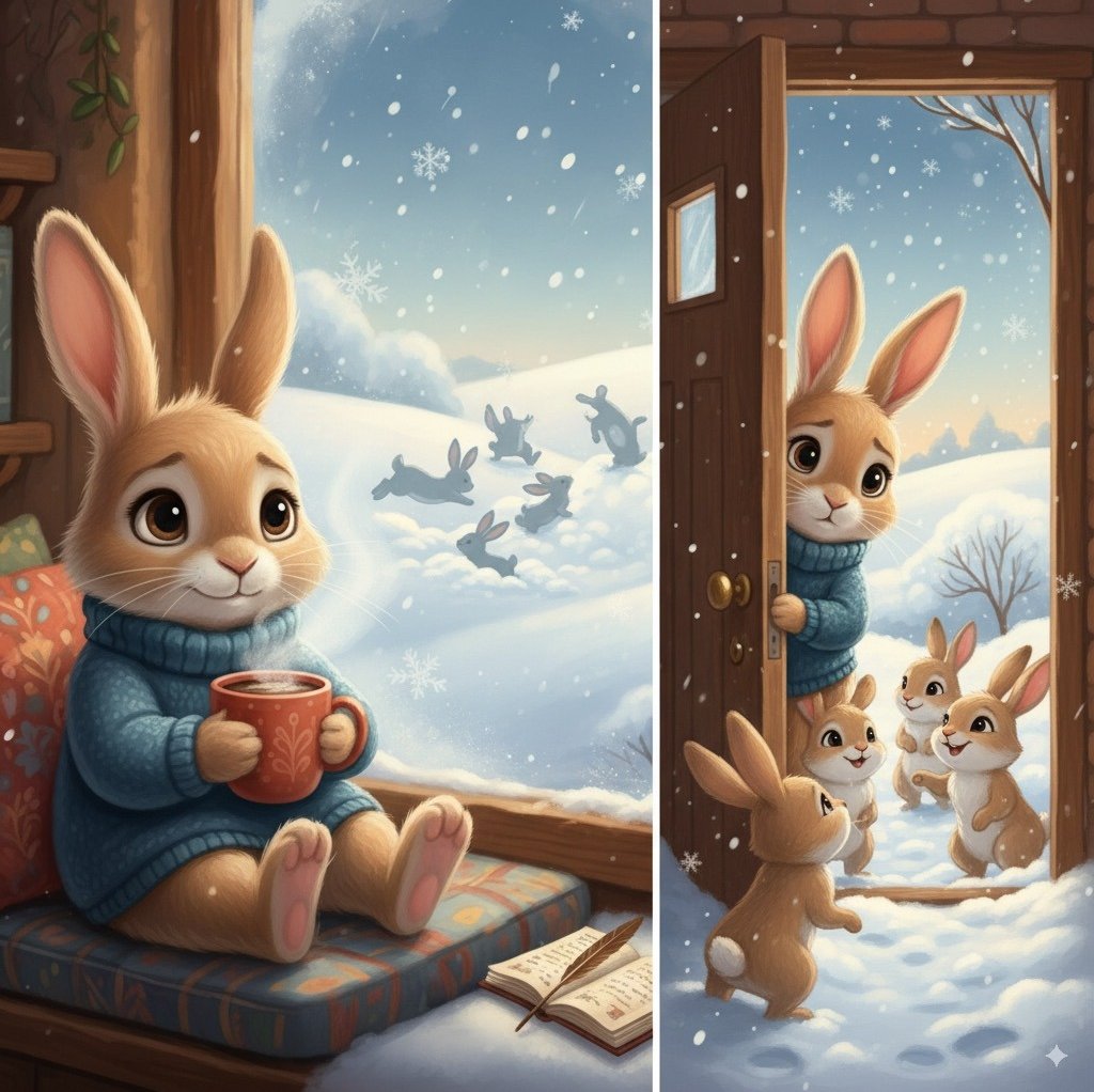 I saw many rabbits playing in snow- jumping and tumbling in fluffy piles, and laughed so loudly I could almost hear them from here. Oh, how I wished I could play with them too.