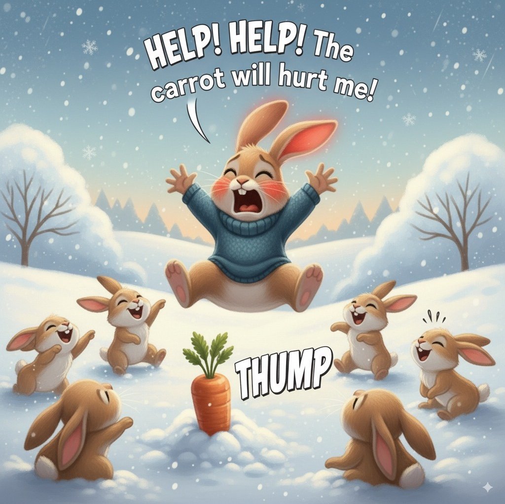 A plump red carrot whizzed through the air towards me. My eyes widened and my paws froze!, and I got afraid when the carrot landed next to my feet “THUMP” and I started to scream and jump all around. “Help! Help! The carrot will hurt me.”