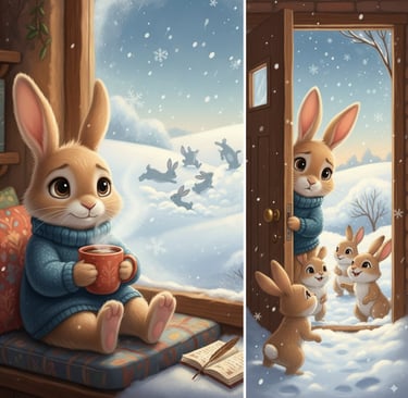 It was a winter morning snowflakes floated down lazily covering the meadow in a white blanket. I sat by the window of my warm little home, paws wrapped around a mug of hot chocolate. The steam ticked my nose and the sweet smell of chocolate made me feel cozy inside.