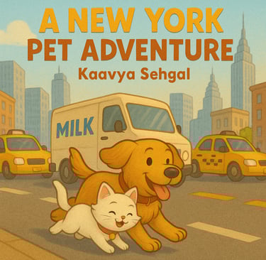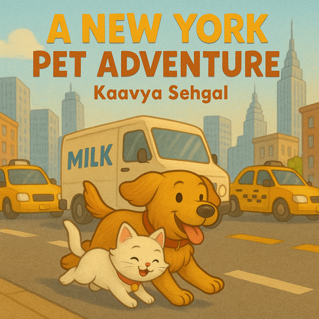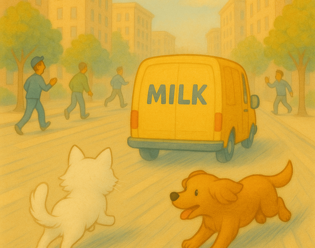 Mitten is chasing the milk van and Guppy is chasing Mitten. It is a wild chase. They made their way through pedestrians, dodged a man walking his dogs, and barely missed a juggler juggling 4 balls at once. The juggler tempts Mitten at first, but she remembers the MILK and keeps running on. When Mitten increased her speed Guppy got worried and barked, “Wait for me Mitten.” Mitten heard it, but didn't stop, thinking about the MILK. The van turned again, this time onto a busy avenue filled with food carts and yellow taxis. But by the time they reached the corner… the van had vanished. And so had their sense of direction.