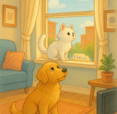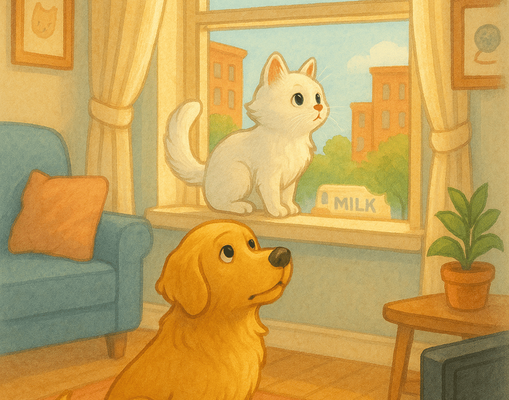 One sunny morning Guppy and Mitten were eating food. Once they were done, Guppy started chasing its tail while Mitten sat bored. Suddenly she leapt on to the window edge and twitched her nose. She caught a whiff that was familiar and very special. It was rich, it was creamy, it was irresistible! It could only mean one thing, and that is MILK!