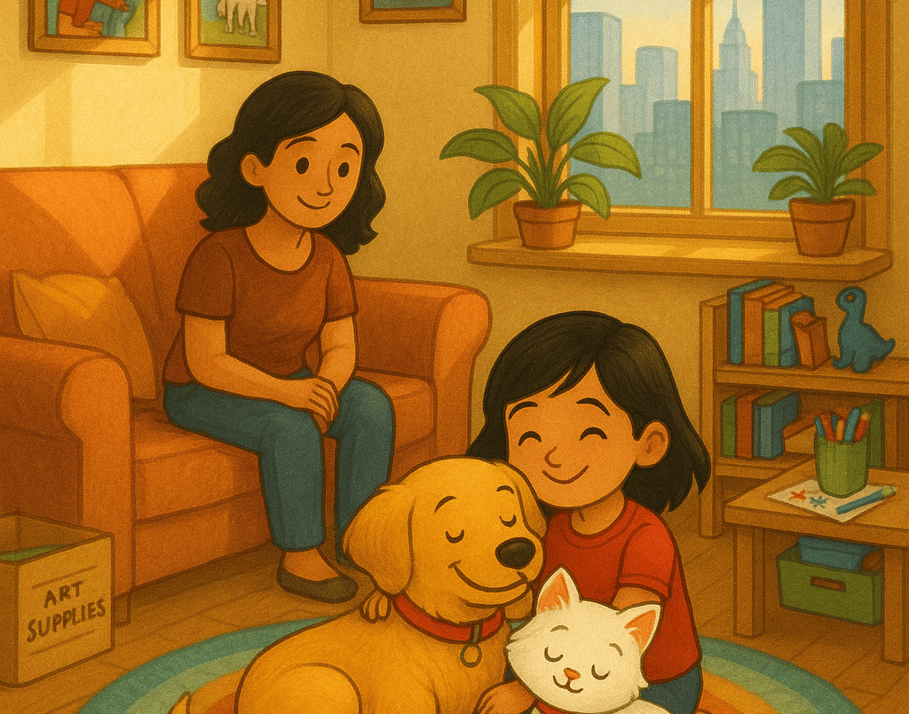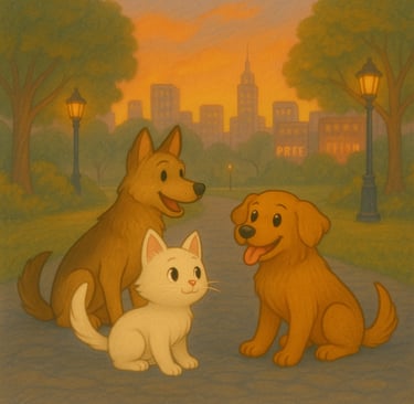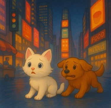 Mitten looked around. “Um… where are we?” Guppy wagged his tail nervously. “I think we’re lost…” They had never been this far from home. All around them were tall buildings, blinking signals, and the scent of pretzels, hot dogs, and… more milk! Guppy looked like his fearless manner had turned into fearful manner. And clearly Mitten was shaking with fear. Both of them were dead scared. They were missing Alice a lot. They thought about moments when Alice used to play with them. They were very worried.
