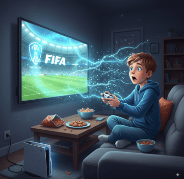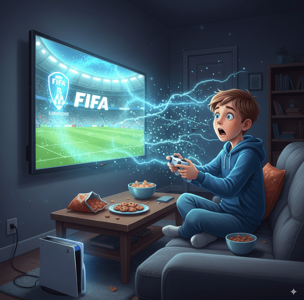 It was a lazy sunday, a boy named Peter as usual was playing soccer on his PS-5 while munching his favorite snackschips and cookies. He had been glued to the screen for hours now. He was playing FIFA on his PS-5. Suddenly he went inside the play station 5 and he was shocked! How did this happen?