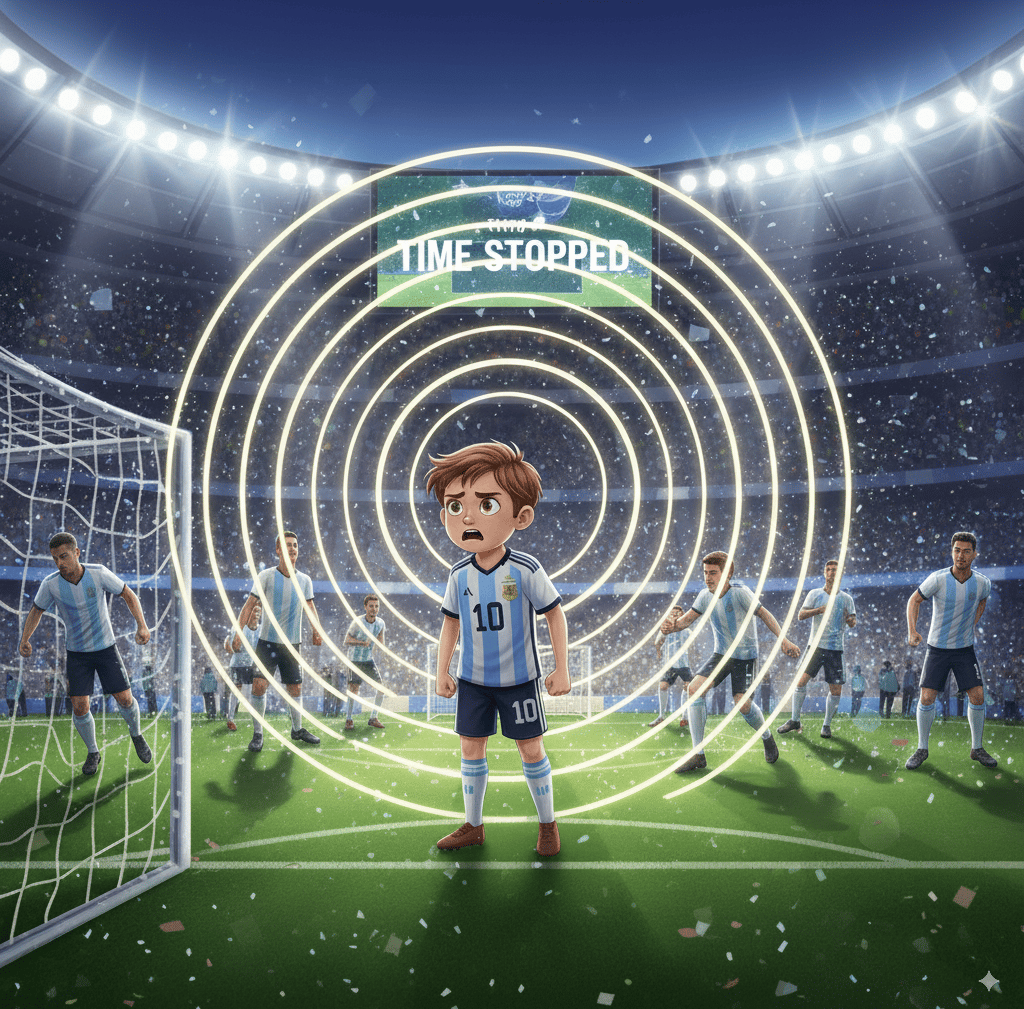 Another match started and he thought to himself, what to do? As he was lost in his thoughts, he wasn't able to goal or defend anything. He started to panic. He suddenly heard a loud whistle. Everything froze- the stadium, the players, even Ronaldo.