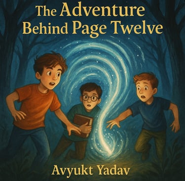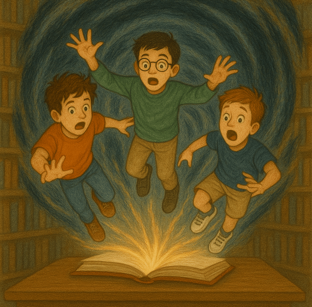 As they reached the twelfth page, something strange happened. A tiny dot appeared on the paper. It grew bigger and bigger until it turned into a swirling portal- and suddenly sucked them in.