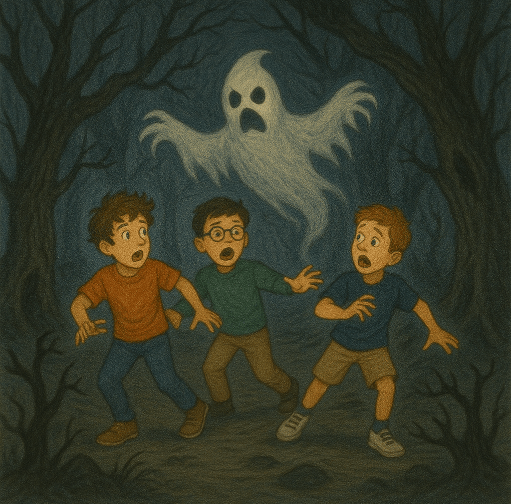 The trees around were crooked and twisted and looked like monsters looming in the dark. A weird ghost with a rough, growling voice suddenly appeared and frightened Logan, William and Benjamin.