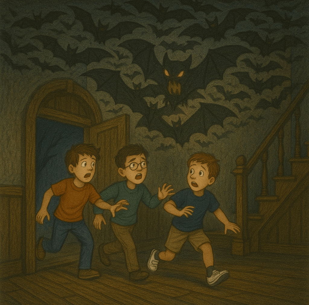 Inside, bats flew in a massive colony, flapping their wings together, creating the shape of a large monster. They hesitated a bit but ran inside.