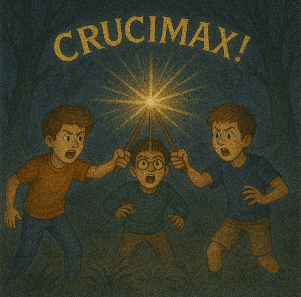 Three of them raised their wands and shouted “Crucimax!” Suddenly, everything lit-up and the ghost turned into an angel.
