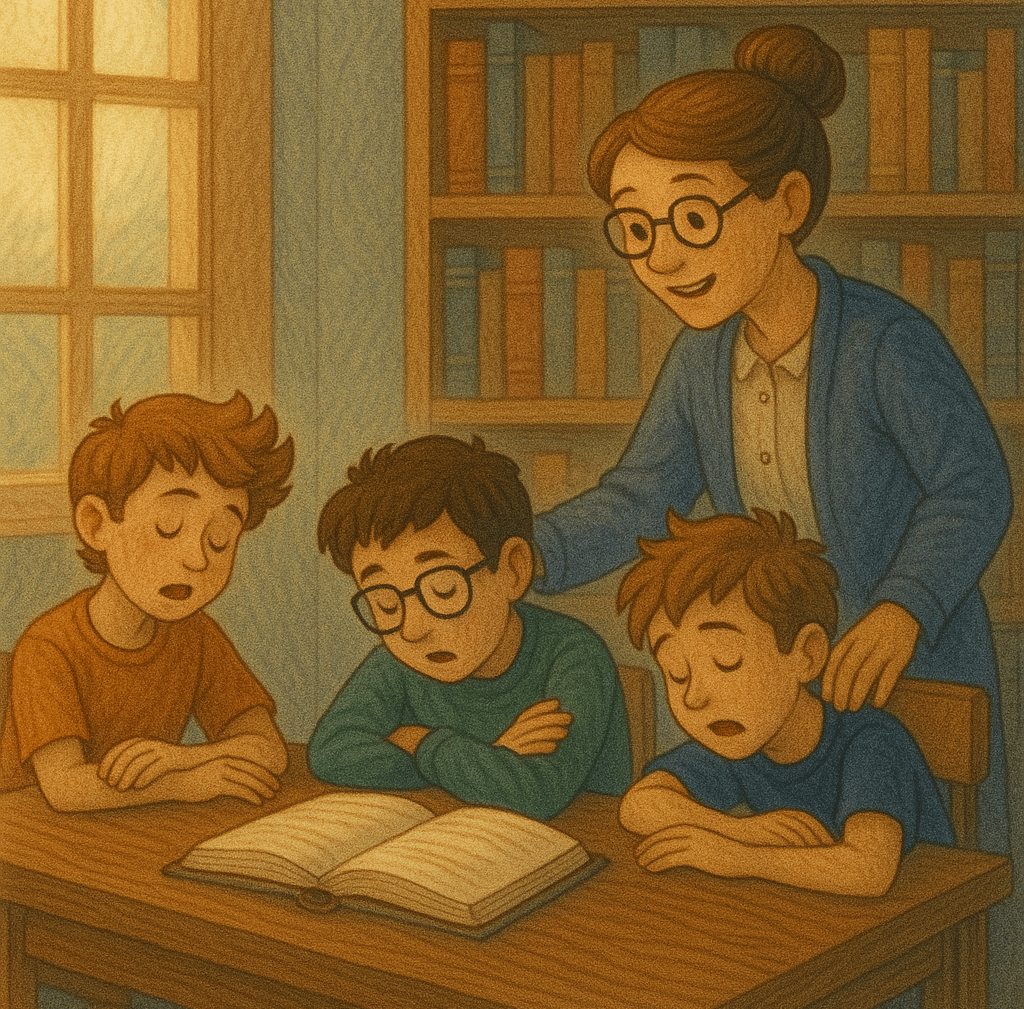 The librarian walked over and gently shook them awake. “Come on, boys. You can’t nap in the library. Finish reading your book!”