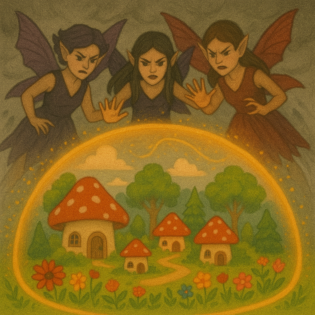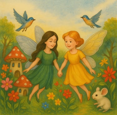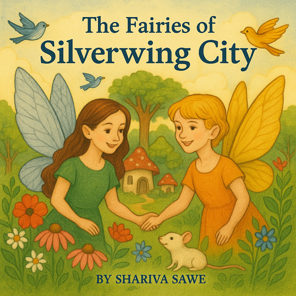 In the heart of Silverwing City lived two beautiful fairies Sinwie and Charlie. Silverwing City was a perfect fairyland, filled with tiny mushroom houses, vibrant flowers, and magical trees. The air was always bright and cheerful, and birds sang melodious tunes as they fluttered across the sky. Friendly white mice scurried around, always ready to lend a helping paw especially during celebrations and festivals.