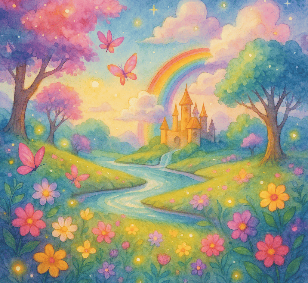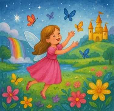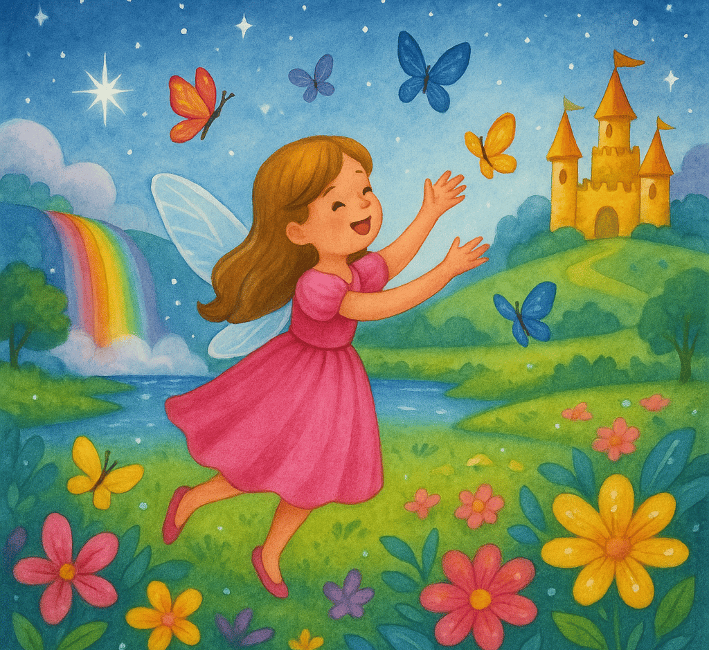Lila lived in a magical place called Fairyland. It had sparkly flowers, rainbow waterfalls, and clouds you could jump on like trampolines! The trees giggled, butterflies sang songs, and everything smelled like candy.