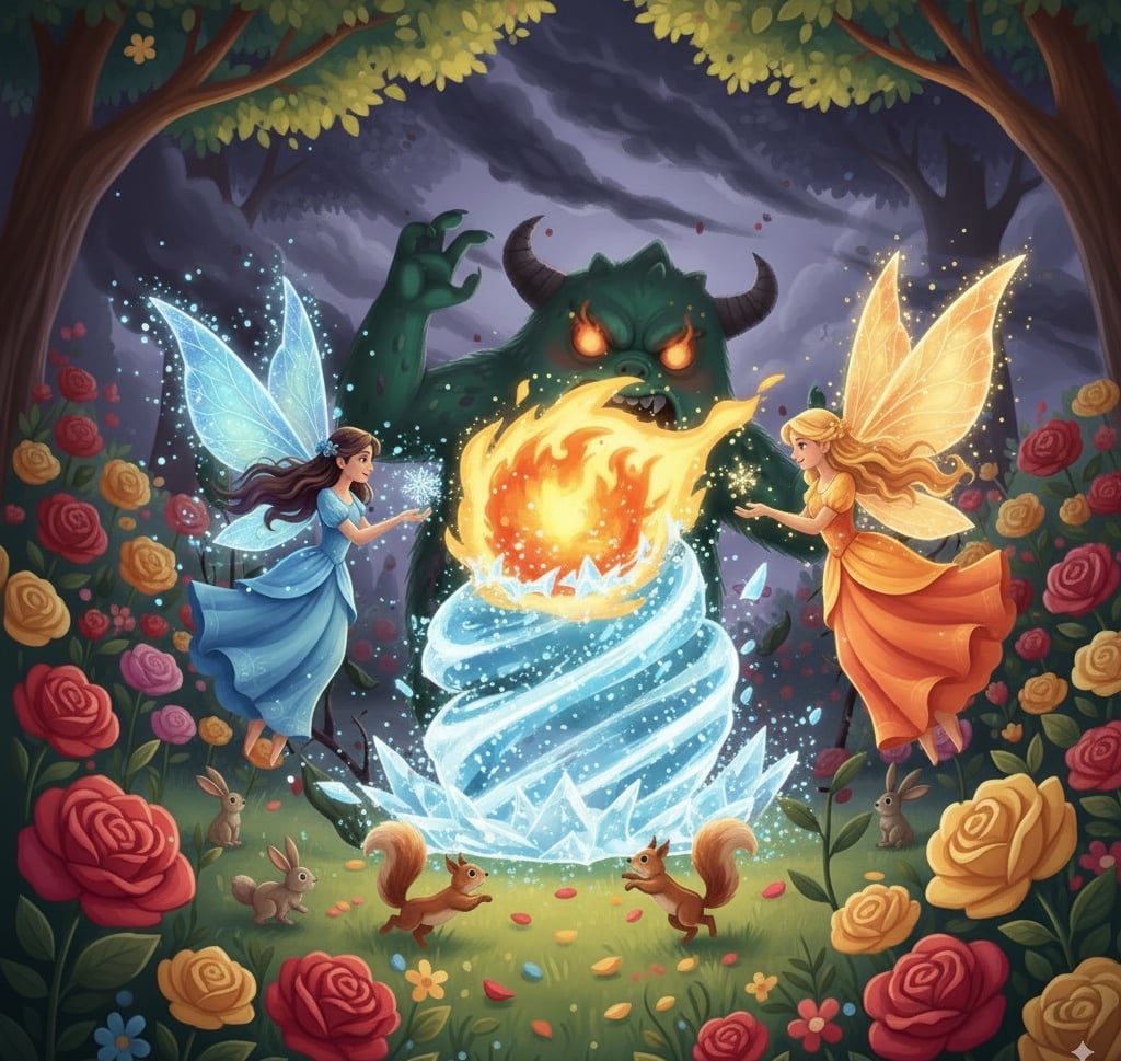 The battle started. The monster hurled a fireball at Sia, but she quickly raised her hands, freezing the flames into glittering ice. The monster snarled and tried again.