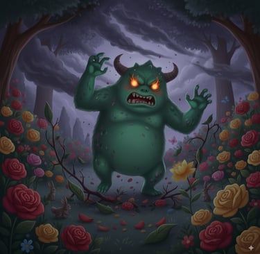 The wind howled, and the cheerful garden suddenly grew dim. Out of the shadows appeared a monster. He had green, slimy skin, red fiery eyes, and three horns.