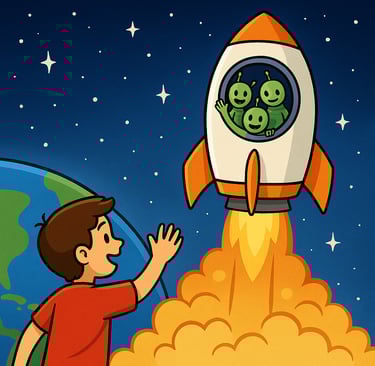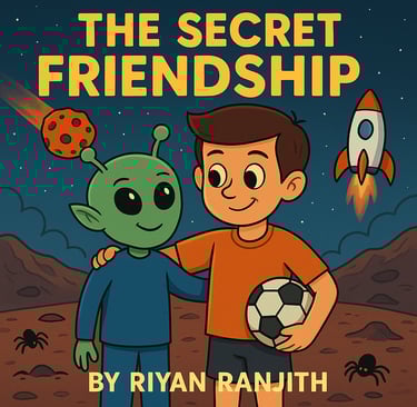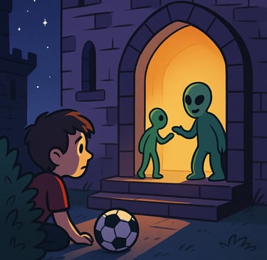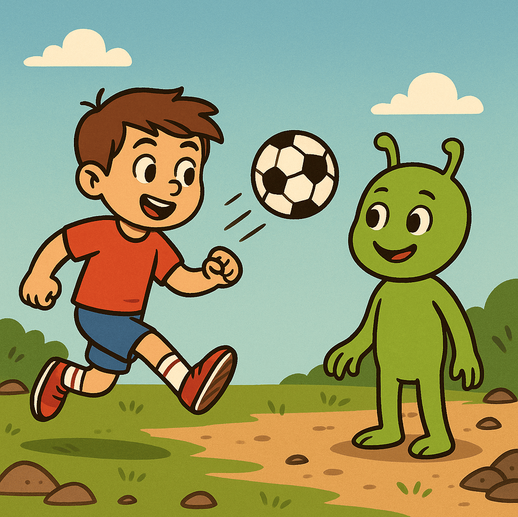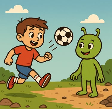 One day, a boy named Peter, who loved to play football, was kicking his ball around when it rolled toward an alien. The alien looked at Peter, and Peter froze, thinking it might hurt him. But to his surprise, the alien smiled and returned the ball. Peter thought, “If he returned the ball, maybe he’s friendly.” So he took a chance and asked the alien’s name.