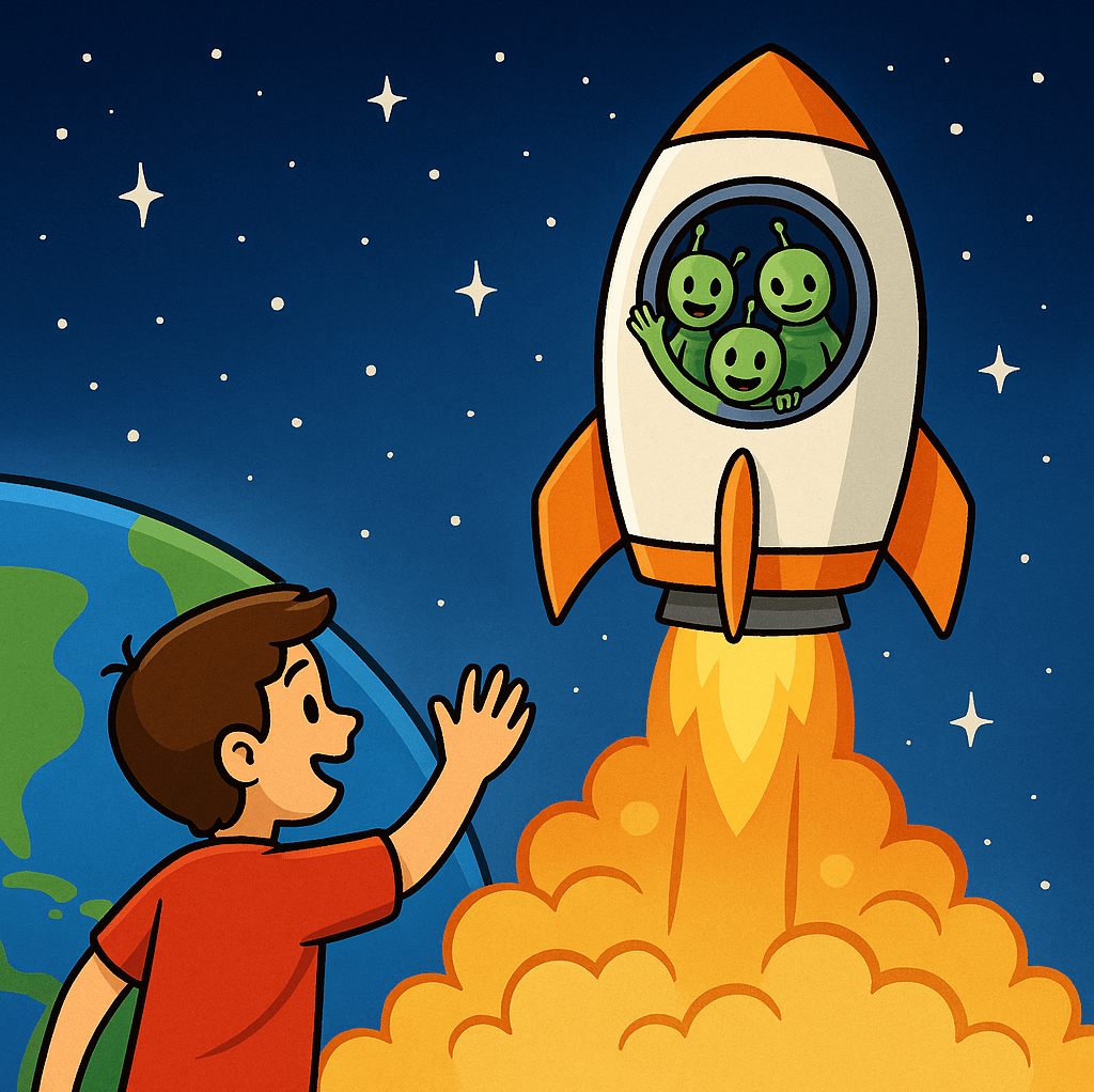 Then Alex boarded the rocket with his fellow aliens, and they returned to their home planet.